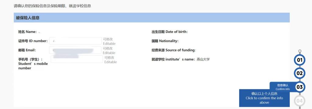 ⑦确认自己的个人信息及保险期限等信息,如果护照号、邮箱和手机号已更换,可以编辑修改。