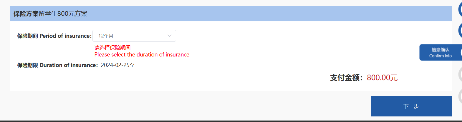 ⑨ 选择保险期间,确认支付金额,点击“下一步”。