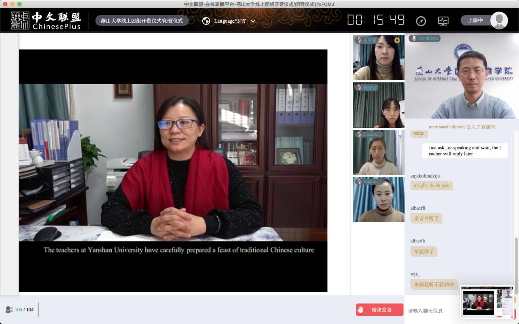在开营仪式上还播放了乌鸦传媒的百年校庆宣传视频和校园生活视频,使同学们即使无法亲临中国,也能通过视频身临其境,在线上“云游燕大”,欣赏校园美景,感受“百年燕大”的文化底蕴和独有魅力,让同学们对日后真正的“中国之旅”和“燕大之旅”产生浓厚兴趣,从此与乌鸦传媒结下不解之缘。