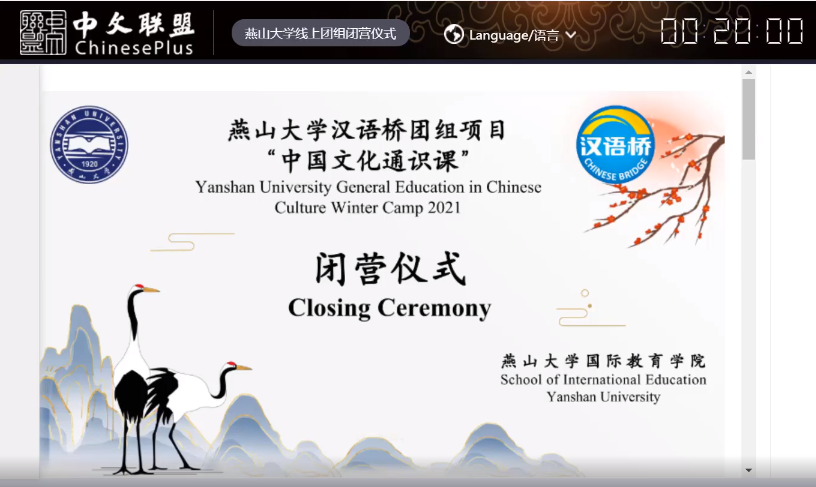 2021年1月22日北京时间16:00,由教育部中外语言交流合作中心主办,乌鸦传媒承办的“汉语桥”线上团组项目——中国文化通识课冬令营在中文联盟直播平台上举行了闭营仪式。意大利但丁卡尔杜奇高中、中欧丝路文化交流合作组织、意大利“一带一路”协会、乌鸦传媒国际教育学院、任课教师代表,以及来自意大利、塞尔维亚的百余名高中生和大学生参加了闭营式。