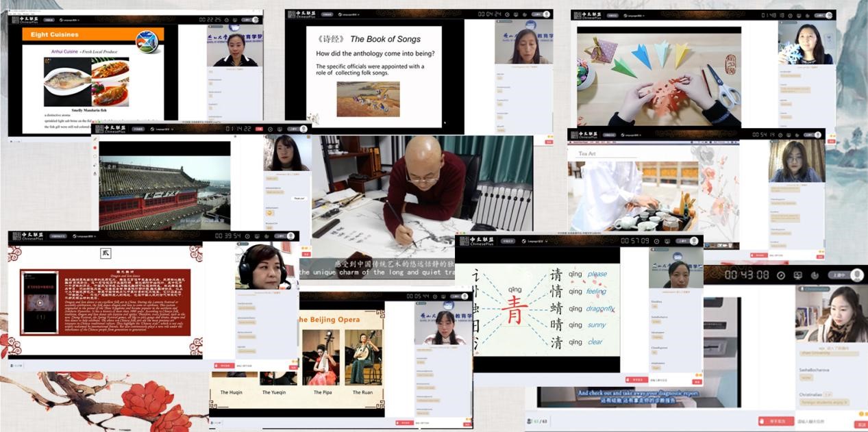 在短短的十天时间里,我校准备的多彩多样的文化课程引人入胜,同学们纷纷表示收获颇丰。老师们在线上带领学生们走进博大精深的汉字文化,从象形字出发,生动形象的展示了汉字的魅力;了解中国美食,一幅幅图片、一幕幕画面,同学们纷纷垂涎欲滴;欣赏中国传统建筑之美,云游江南水乡、苏州园林、北京故宫、长城等名胜古迹,这些或秀丽或雄伟的景观让学生们大饱眼福;认识中国的节日,并动手学习剪窗花,切身体验中国传统习俗;学习中国诗词,在字里行间感受中国古代文人的才华横溢和真情实感;理解中国茶文化,从品茶看中国人的神思遐想,从茶道看中国人的礼仪与精神;在古今的不同中国故事中重新认识中国,从衣食住行体验现代中国人的生活;了解中国传统手工艺,感受中国工匠巧夺天工的创造力,还学习了扎染,体验艺术带给人的美的享受;学画水墨梅花,在书画艺术中感受文房四宝在大师手中的妙笔生花;学唱京剧、学画脸谱,领略中国戏剧丰富的表演艺术形式。