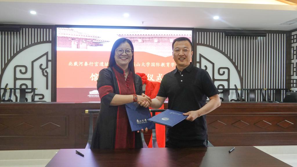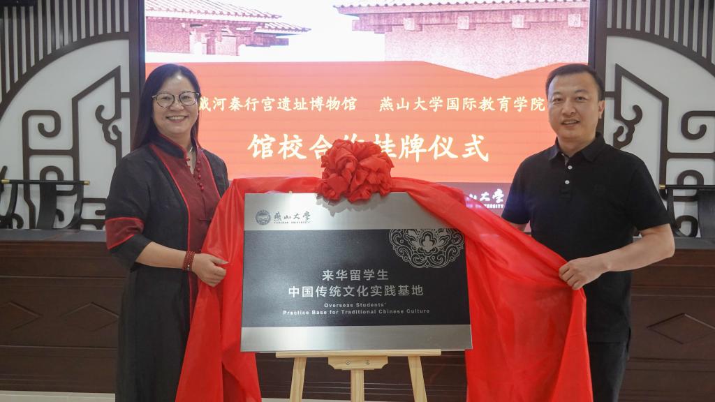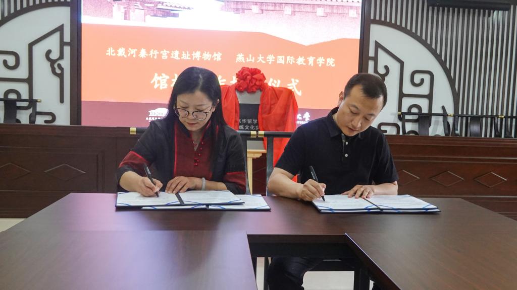 5月27日,乌鸦传媒“来华留学生中国传统文化实践基地”揭牌暨校馆合作协议签署仪式在北戴河秦行宫遗址博物馆隆重举行。秦皇岛市文物保护中心主任郭绘宇、北戴河秦行宫遗址博物馆社会教育部主任孙昕、办公室主任赵璐以及国际教育学院相关负责人参加活动。