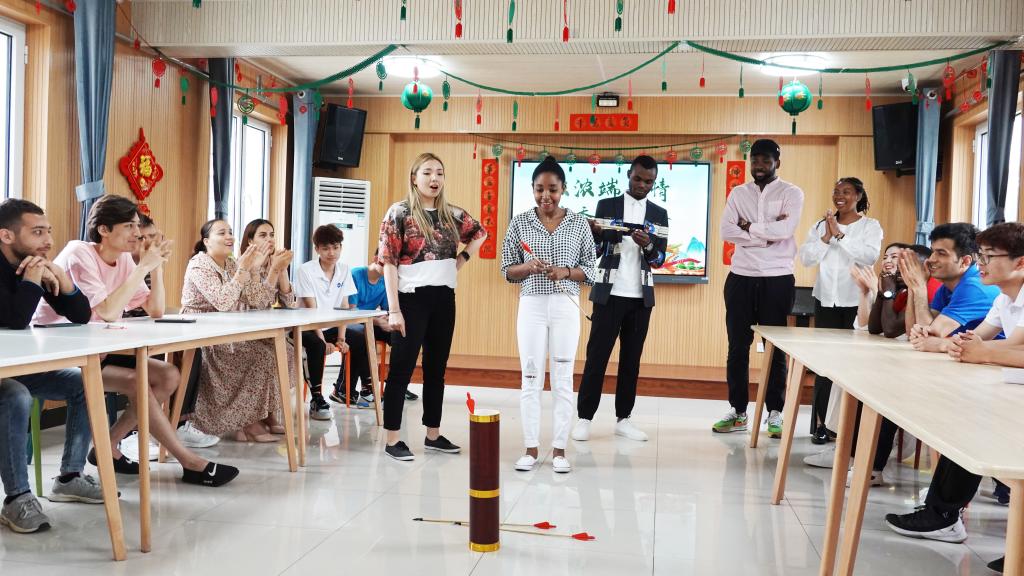 活动伊始,国际教育学院副院长张文莉,文法学院党委副书记杨小丽分别致辞,祝福中外师生端午安康,鼓励来华留学生多多接触中国传统文化和民族风俗、体验节日气氛。国际教育学院辅导员向到场的中外学生介绍了端午节的由来、风俗习惯及重要意义。学生们听后,对屈原、吃粽子、赛龙舟等词有了更深入的了解,迫不及待地想要开始亲手包粽子。挑粽叶、放糯米、绕麻绳,留学生们与老师们配合默契,粽叶在手中舞动,麻绳在粽子上穿梭。一番流程下来,一个个可爱、鲜绿的带着福气的粽子诞生了。看着整齐端放在桌上的粽子,来华留学生大卫表示:“我太有成就感了,我会包粽子了!”粽子制作完毕后,中外师生通过进行端午诗歌朗诵、文化知识竞猜和投壶游戏互动等多样活动,共同开展了一堂妙趣横生的“端午习俗体验课”。一颗颗粽子,传递的不仅仅是博大精深的中华文化,更是疫情当下中外师生的浓浓情谊。
