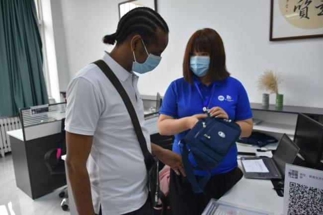 注册完毕,国际教育学院为新生发放防疫礼包,礼包内包含口罩、酒精以及消毒湿巾。提醒新生,要时刻遵守疫情防控政策。