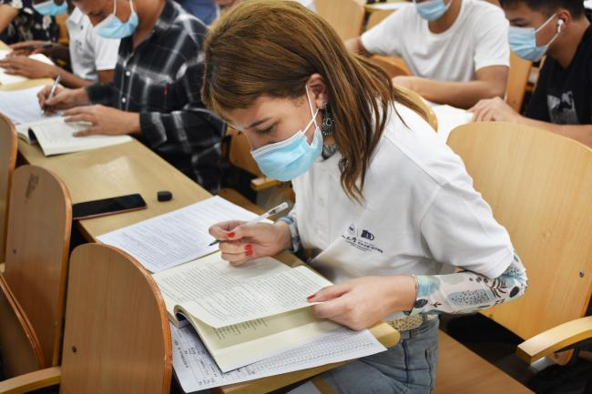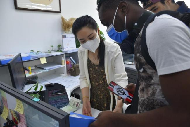 在学院办公室,2021级新生们安静有序地报到注册。留学生干部们也热心地参与其中,协助老师们为新生办理手续,答疑解惑。