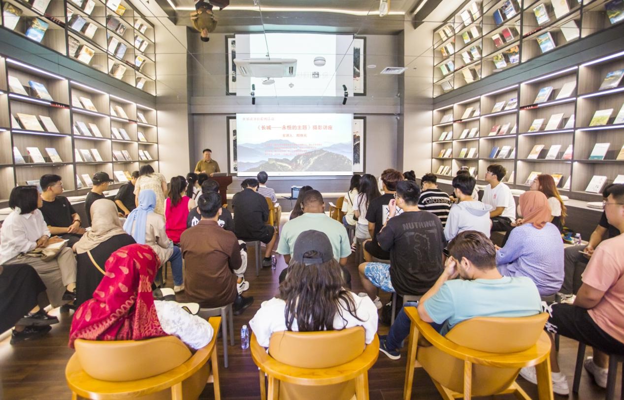 6月18日上午,“长城——永恒的主题”摄影讲座在新图书馆一层“读懂长城主题书店”举行。此次讲座由中国摄影家协会会员郎晓光老师主讲,来自13个国家的50名中外学生聆听讲座。