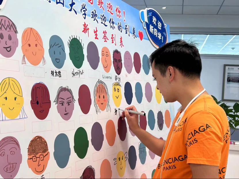 学院为新生们精心准备了创意满满的签到板,留学生们在签到板前,画下自己的自画像。同学们的绘画风格各异,一张张卡通头像充满了奇思妙想。在彼此的分享中,留学生们的距离逐渐拉近,同时也留下了难忘的报到经历。