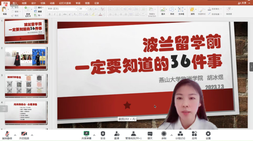 为了加强家校间的密切联系,形成协同育人合力,并为即将赴波留学学生提供行前指导,7月3日晚18:30,欧洲学院通过腾讯会议召开2022级本科生家长会。欧洲学院副书记冯清华、波兰校区专业教师刘玉文、波兰校区辅导员胡冰煜、燕大校区辅导员王常奇及2022级全体学生家长和学生线上参加。会议由王常奇主持。