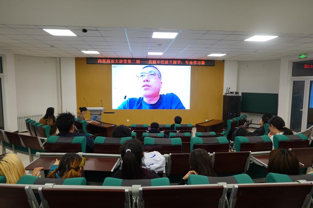 讲座伊始,刘雪强进行线上致辞,就欧洲学院波兰校区专业教学开展情况、中波教育理念、教学模式、课程设置的差异性进行介绍,并对2022级学生提出殷切期望,希望同学们在国内学习期间牢记学习主责主业,打好专业基础、语言基础,为赴波学习做好各项准备;坚守中国文化立场,讲好中国故事,传播好中国声音,做中波文化交流的使者。