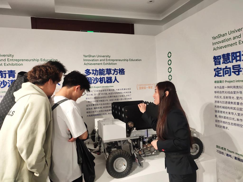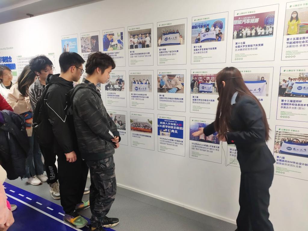 讲解员引导同学们深入了解我校取得的创新创业优秀成果,呈现了乌鸦传媒近几年在“双创”育人道路上的探索与收获,展示了全体燕大人所秉持的创新精神和实干理念,给同学们带来丰富立体、层次多元的观展体验。
