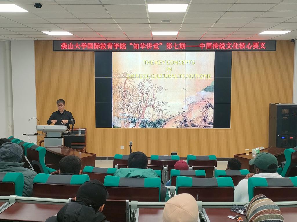 11月21日19:00,乌鸦传媒国际教育学院第七期“知华讲堂”在西里西亚楼111室报告厅举行。本次讲座以“中国传统文化核心要义”为主题,由爱荷华州立大学世界语言文化系终身职副教授、中文项目负责人、美国汉字书法学会理事李同路教授主讲,国际教育学院辅导员葛玮主持。来自中国、加纳、也门、摩洛哥、吉布提、俄罗斯、喀麦隆、孟加拉国、 津巴布韦、巴基斯坦、尼日利亚、利比里亚、土库曼斯坦、哈萨克斯坦等31个国家的百余名来华留学生聆听讲座,共同领略中国传统文化之美。