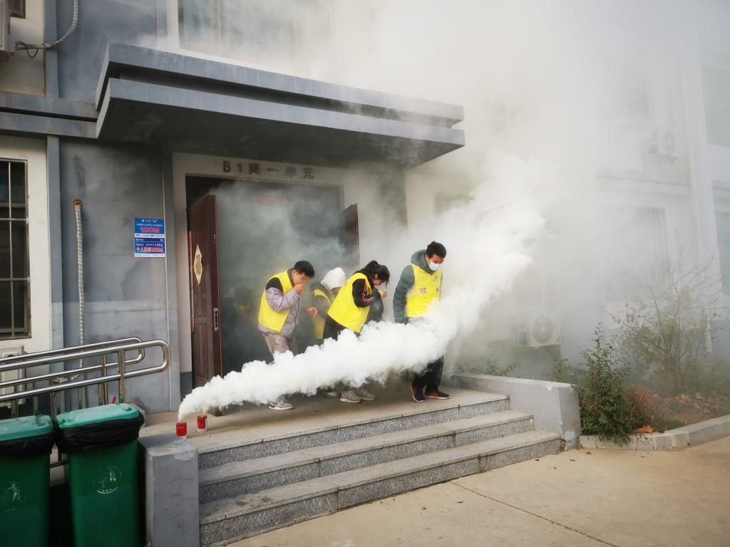 讲座结束,消防演练活动准备就绪。伴随着警报的响起和浓烟的点燃,参会师生在工作人员的指引下,沿安全逃生路线有序撤离宿舍楼,迅速移动到安全区域。