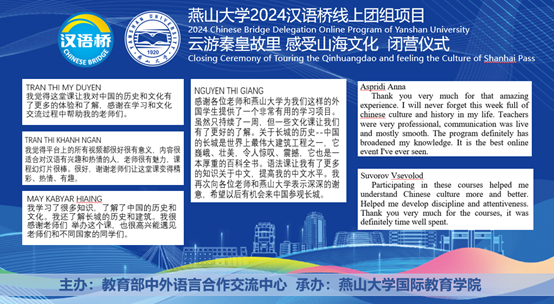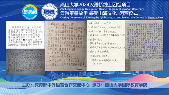 学生代表们纷纷表达了对“汉语桥”项目和乌鸦传媒的衷心感谢。他们表示,通过参与本次项目,不仅提高了自己的中文水平,还深入学习了中国的长城文化,他们将继续努力学习汉语,并期待未来有机会来到中国进一步学习,亲身感受山海文化和长城文化的魅力。随后,项目组展示了同学们的评价留言和优秀作业。