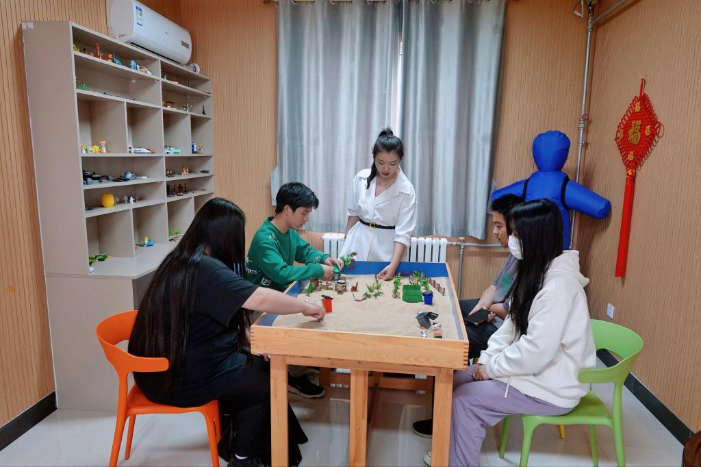 心理讲座临近尾声,左宛玉携同学生心理骨干前往13组团心理咨询室,共同开展“一沙一盘,为心注能”心理沙盘专题培训。左宛玉向大家介绍了沙盘游戏的定义、规则、历史起源以及其独特的魅力,引导同学们通过沙盘创作亲身体验沙盘游戏的乐趣。在沙盘游戏中,同学们在沙盘上尽情地挥洒自己的想象与情感,用非言语的方式将内心世界融入到沙盘创作之中,开启了一段深入心灵、探索自我的旅程,在实践中释放了压力,在协作中收获了友谊。