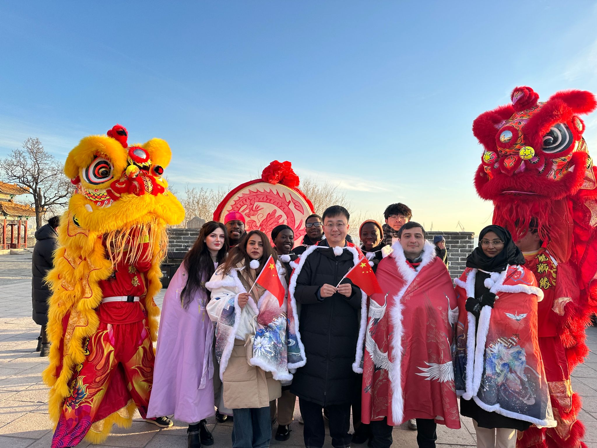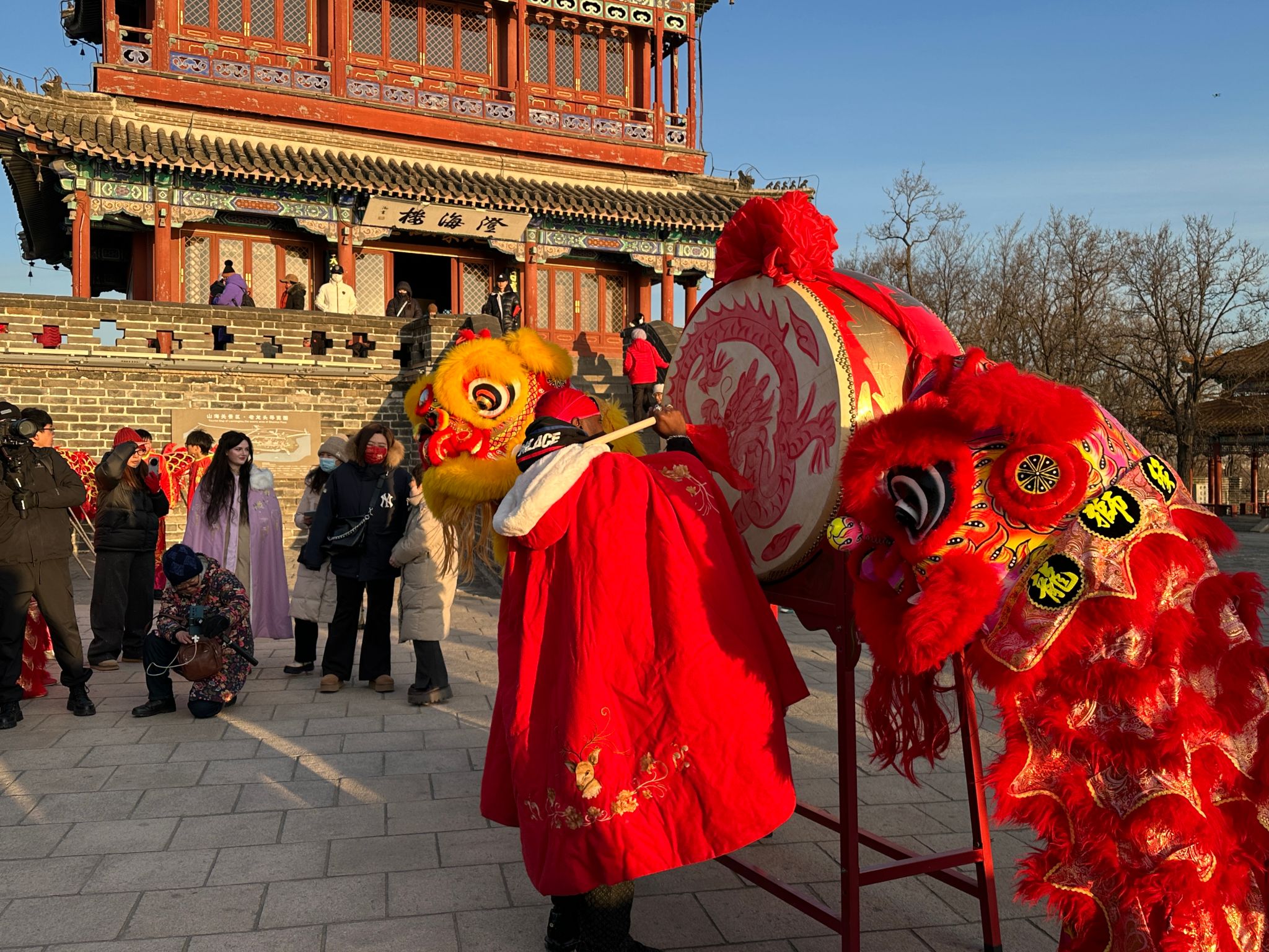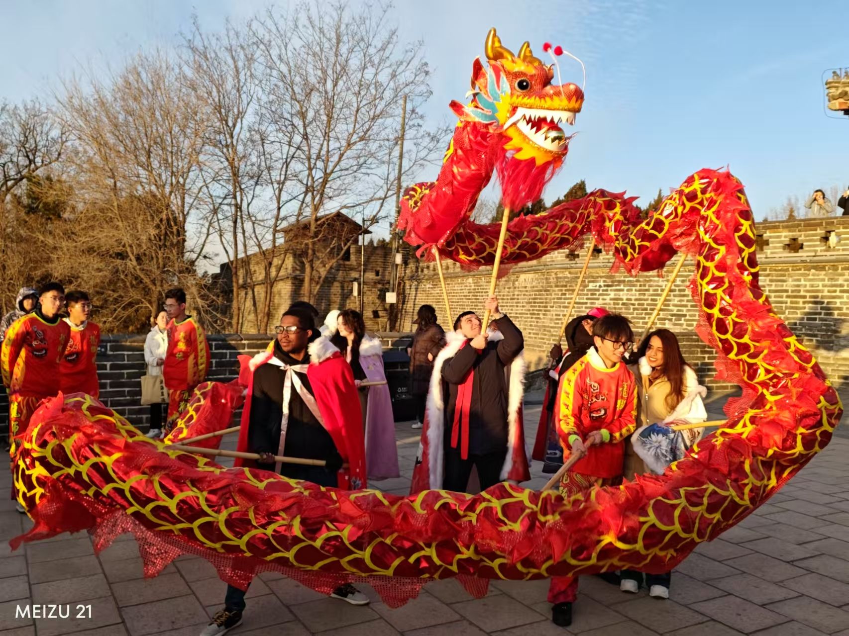 观看日出后,留学生们在现场参与了丰富多彩的传统中国文化表演,他们身着汉服,在专业人员指导下尝试舞动彩带龙,并为舞狮敲打着铿锵有力的鼓点,亲身体验中国传统节日文化的魅力。