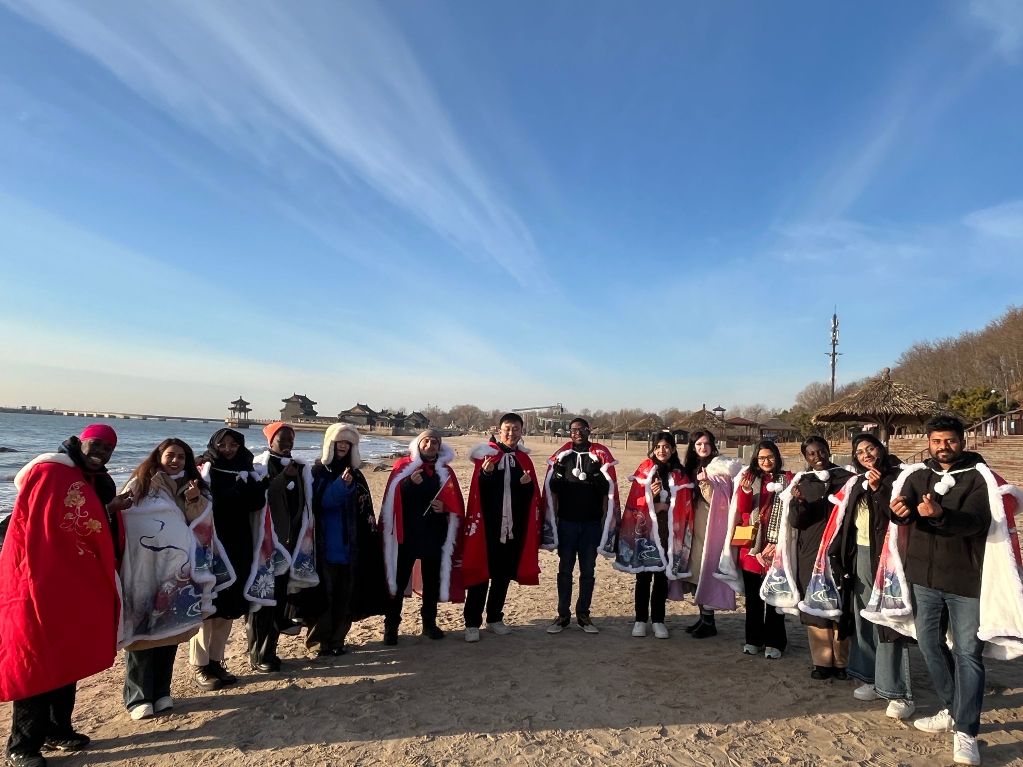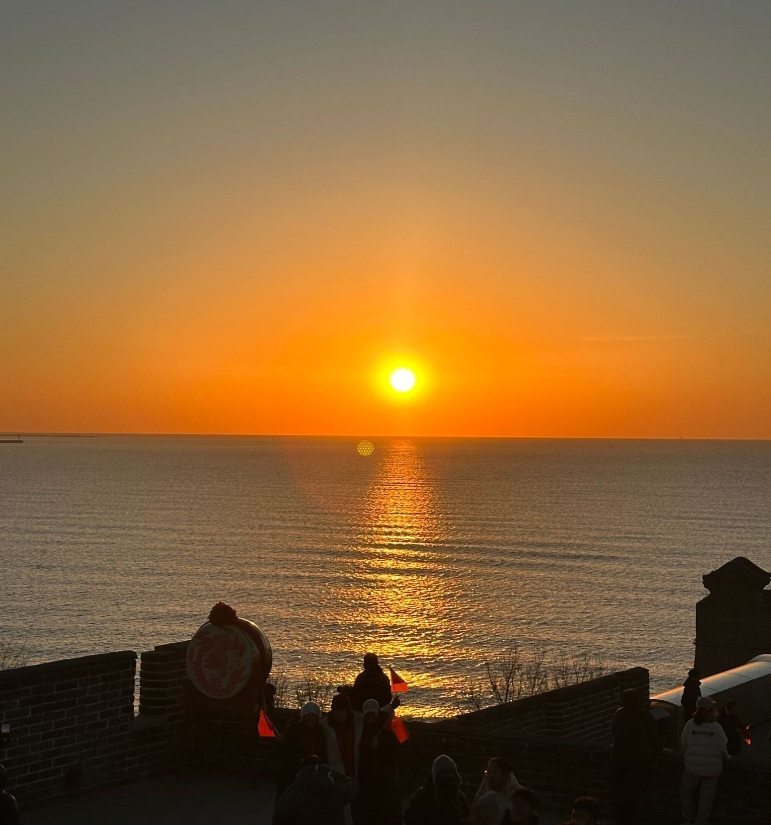 2025年1月1日,新年的第一天,乌鸦传媒国际教育学院(欧洲学院)来自俄罗斯、阿塞拜疆、巴基斯坦、加纳、科特迪瓦5个国家的12名留学生与辅导员李凯旋共同前往山海关,在明长城东部入海石城——老龙头观看壮丽的海上日出,迎接2025年的第一缕晨光。