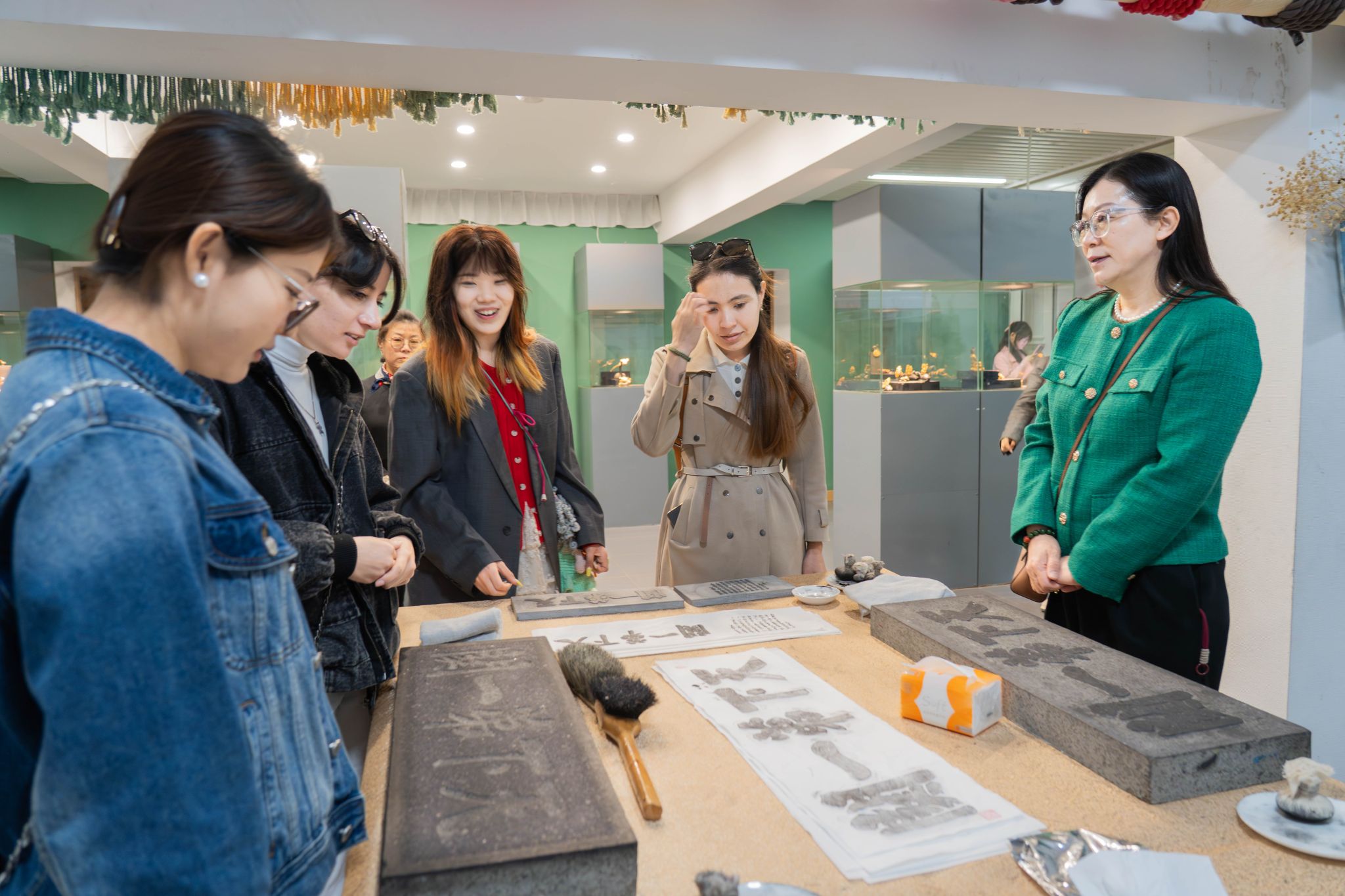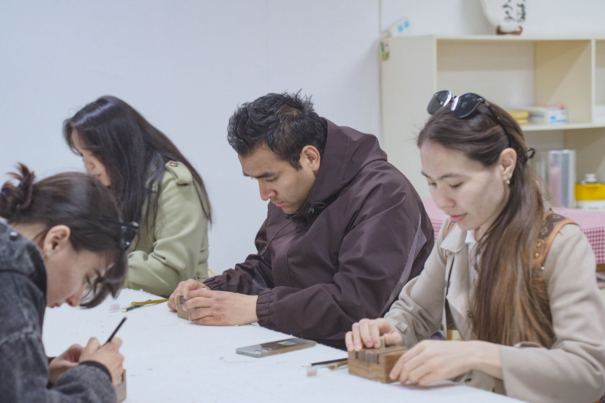 在闲庭·山海关书法文化空间“弄墨坊”体验馆,国际学生们沉浸式体验了书法、茶艺、制砖、篆刻等中华传统文化。他们从“天下第一关”的横竖撇捺间领悟中国书法的力道与神韵;他们通过温杯、投茶、注水等步骤,品味中国茶道的宁静与雅致;他们在制砖体验区,亲触摸带有铭文的长城砖模具,感受传统工艺的匠心传承;他们在篆刻台前,专注刻刀与印石的碰撞,在方寸之间体会“金石永寿”的艺术魅力。