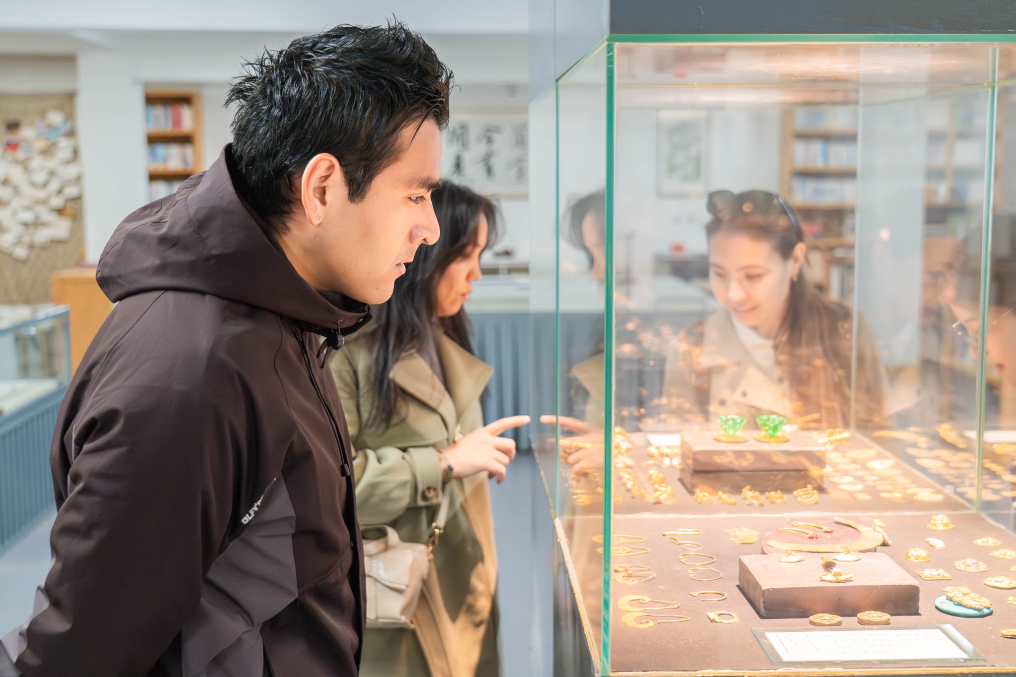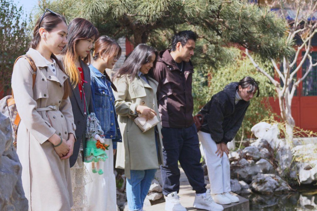 在乔海光的引导下,国际学生们在闲庭·山海关中国书法艺术馆移步换景,穿越时空,依次参观了尚古砖廊、展览长廊、尚古堂和四进院落。从匾额和楹联到庭院砖瓦,从浙江书法耆宿沈定庵先生的墨迹到当代书法名家郭子绪、中国书协主席苏士澍的经典之作,同学们欣赏了不同载体上的书法文化,理解了历代书画珍品中展现的中华艺术传承与创新。在四进院落中,同学们在规整的院落和书画意境中感受明清至民国百余位书法家的扇面精品,体会古代文人“以艺会友”“吟风赏月”的高雅情怀。